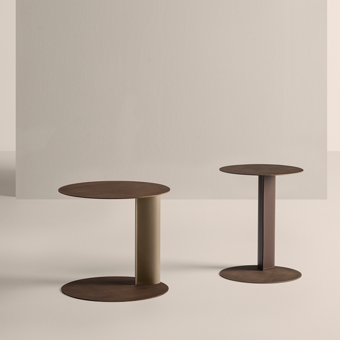 Sofa side table with steel structure and top, finisched with a brushed effect, leg upholstered in saddle leather. Available in two sizes.