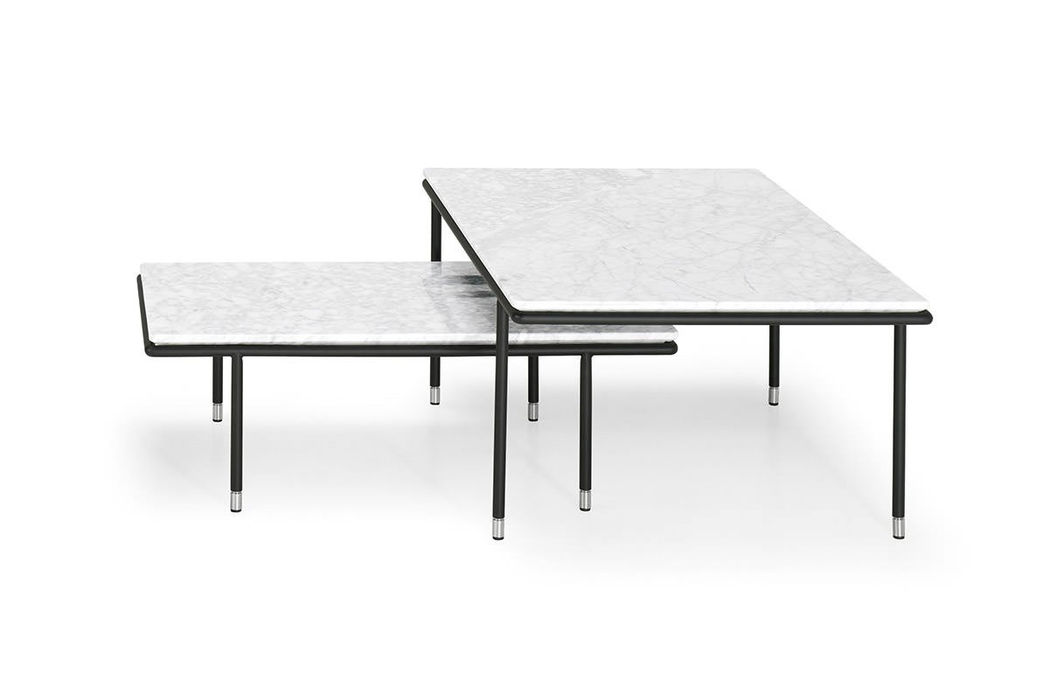 Christophe Pillet's Square collection, one of the most complete and varied in Frag's catalog, updates its coffee table proposal with two new models facing the sofa, with even larger dimensions: 100x100cm and 140x90cm. The tubular frame that designs the base and legs, a common thread linking the various production types, in the coffee tables also supports the top, which is available in the precious marbles in the catalog and in light gray and slate gray cement-effect paints.