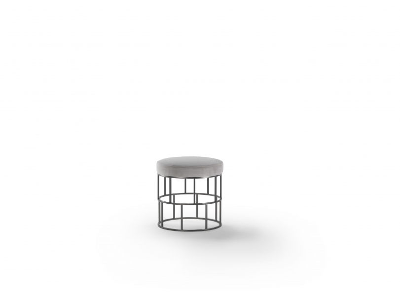 An original metal base is the trademark feature of this sophisticated collection that comprises a bench, ottoman, coffee and side tables. The design of the oval-shaped metal structure – available in different finishes – is made up of a series of rings separated by vertical bars that conjure up the essence of airy lightness. The seat cushion upholstery is completely removable, in both the fabric and leather versions.