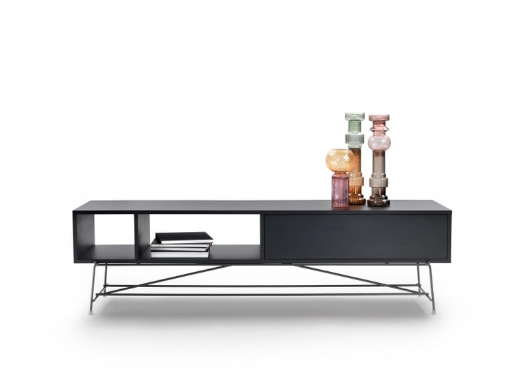The variety of available modules – stand-alone, L-shaped and asymmetrical seating elements, ottomans and chaise longues, cowhide-clad storage, and wood coffee tables – allow for the creation of a great number of arrangements: from more compact stand-alone versions, ideal for face-to-face placement, to larger, more complex solutions, designed to enliven a distinctly contemporary domestic landscape.