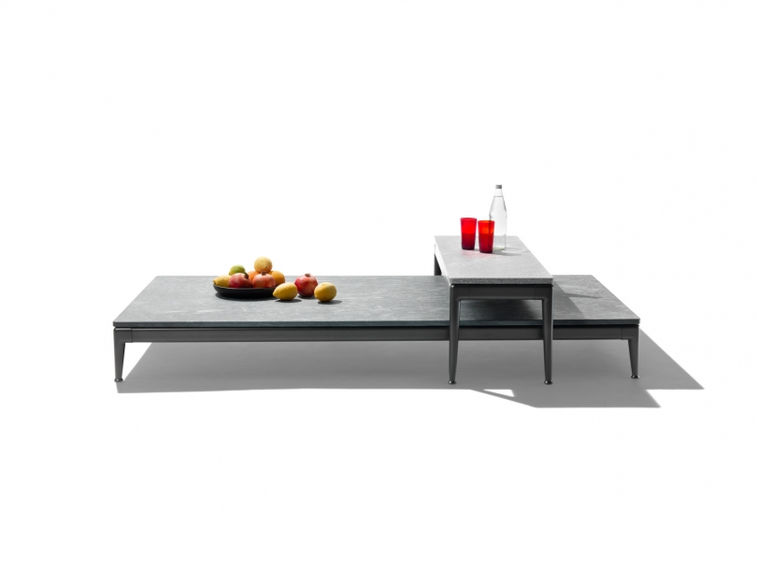 The Ansel sofas are distinguished by an unexpected combination of materials: fitted into the sleek stainless-steel base is a structure of armrests and backrests made of slats in massive wood.
